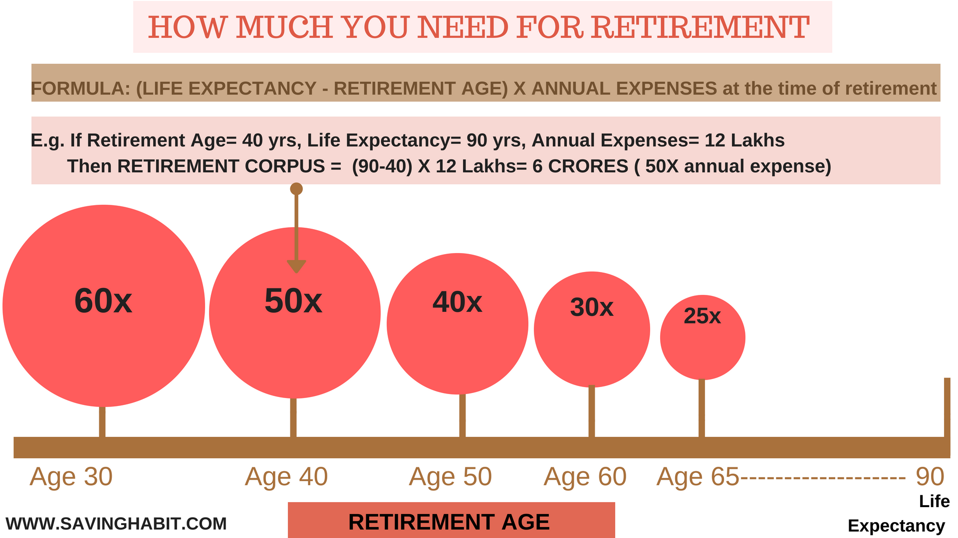 - Age 50-65: Once your new venture succeeds, invest any surplus to grow the 25X to give yourself a really secure old-age retirement. You have another 15 years to grow the 25X into say 40-50X.